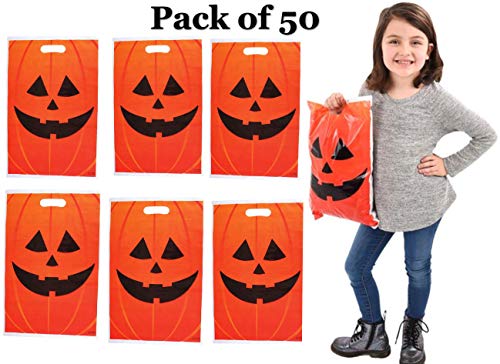 50‑Pack 11″ × 17″ Jack O Lantern Trick or Treat Goody Bags – Durable Plastic Halloween Party Favor Bags